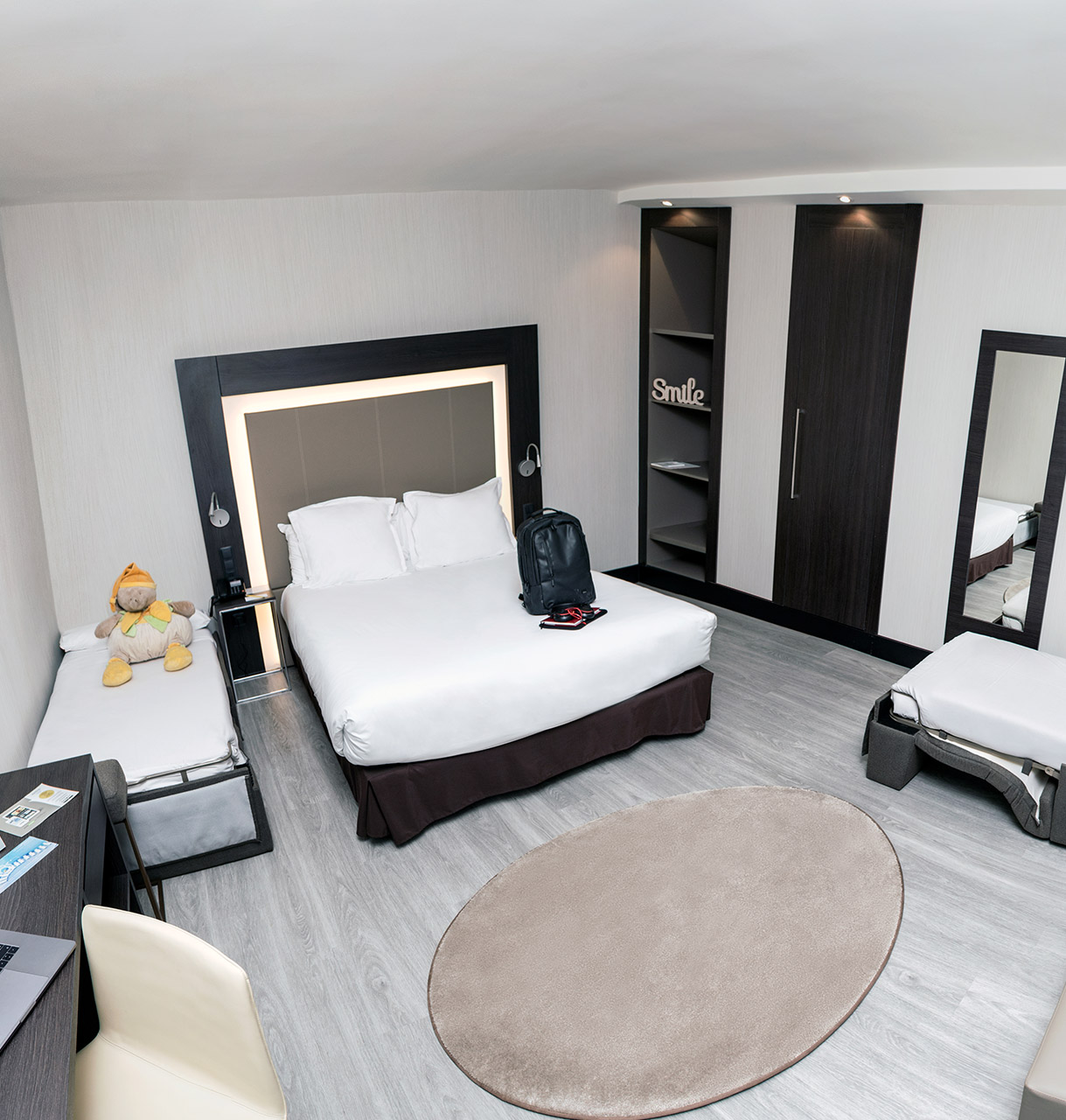 Ensures you enjoy a relaxing stay and is fully equipped, featuring a double bed and two free children’s beds, free WIFI, air conditioning, minibar, 37-inch TV, hair dryer, safe and rain shower.